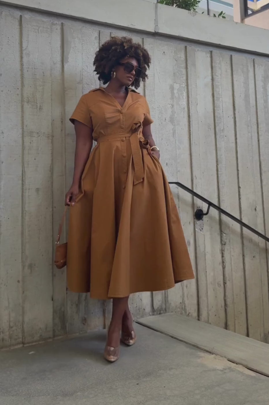 This Blaine dress blends structure with drama, thanks to its tailored bodice fit, voluminous skirt, and classic collar neckline. Buttoned through the front with side pockets and a matching belt, it’s made to shape the waist while giving movement through the hem. Crafted from a premium cotton, this dress has just the right weight, making it an effortless choice for the fall season.